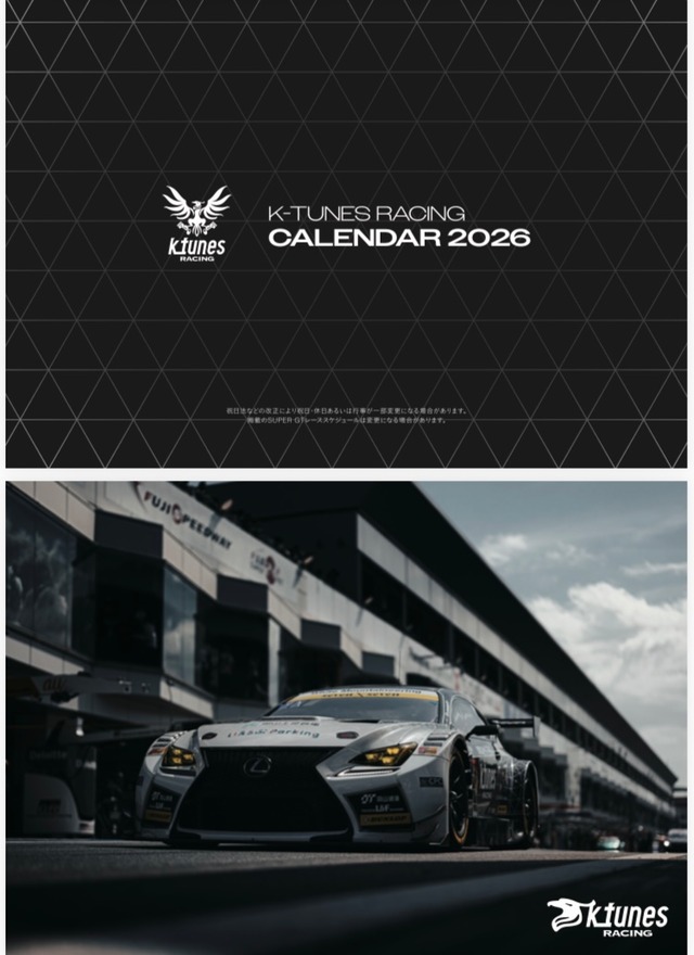 K-tunes Racing 2026 CALENDARがついに登場! 毎月K-tunes Racingの車をお楽しみいただけます。 レースファンにはたまらないアイテムですので、ぜひ手に入れてください! K-tunes RacingのカレンダーにはSUPER GT/WorldChallengeAsia JapanCupの日程が記載されています。 カレンダーサイズは普通のデスクや壁にぴったりのサイズです。鮮やかな写真が日々の生活を盛り上げてくれることでしょう。K-tunes Racingの世界観を感じながら、365日を楽しんでください! ※12月24日までにご注文いただいた方は年内発送です。 12月25日以降にご注文の方は2026年1月上旬発送となります。 ※カラーはモニターの設定により実物と異なる場合があります。